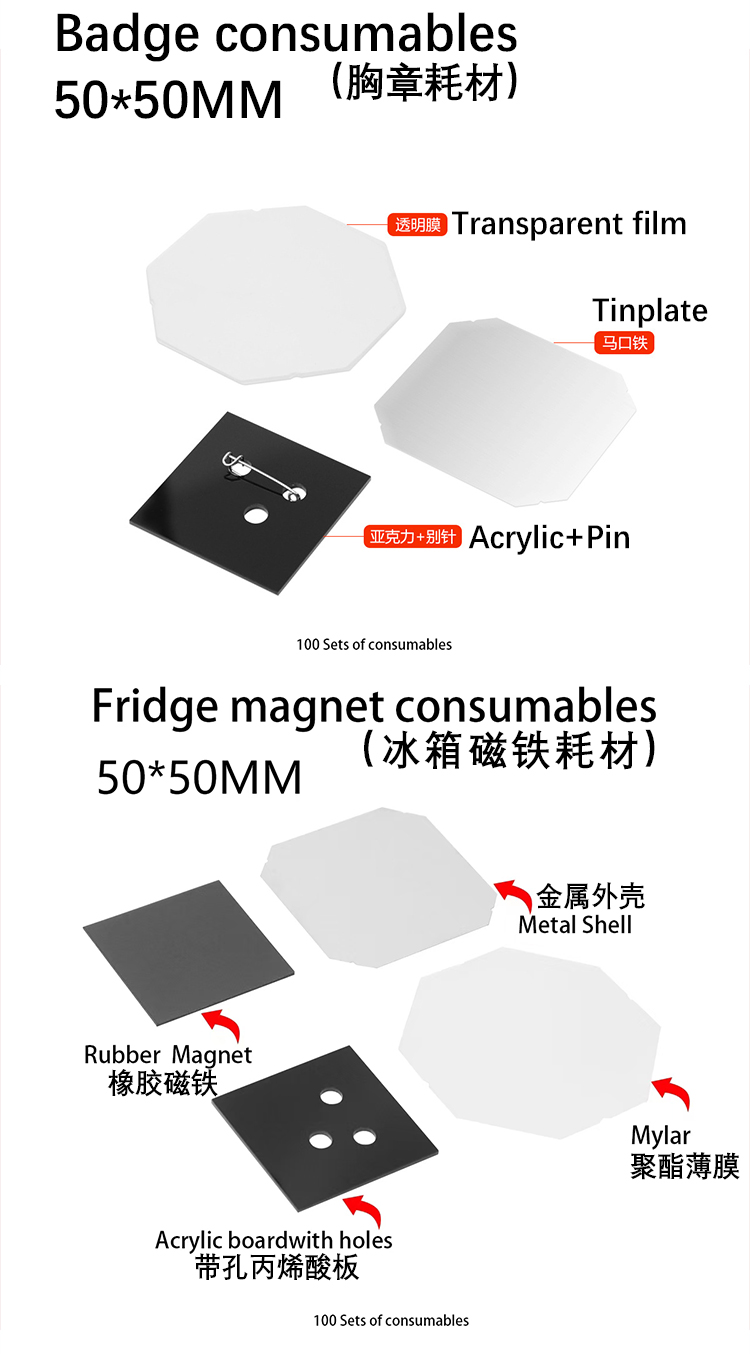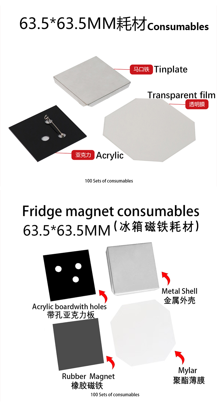 - 冰箱磁性按钮 1 套包括 1 个上壳 + 1 个聚酯薄膜 + 1 个纸板 + 1 个橡胶磁性片-